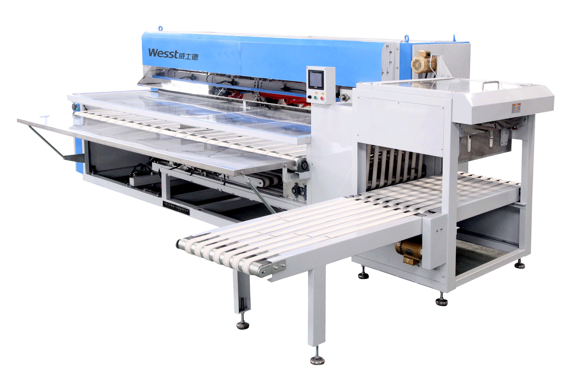 一套完整的高速后整理线包括了高速展布机、高速熨平机、高速折叠机、堆码机、枕套折叠机等设备。